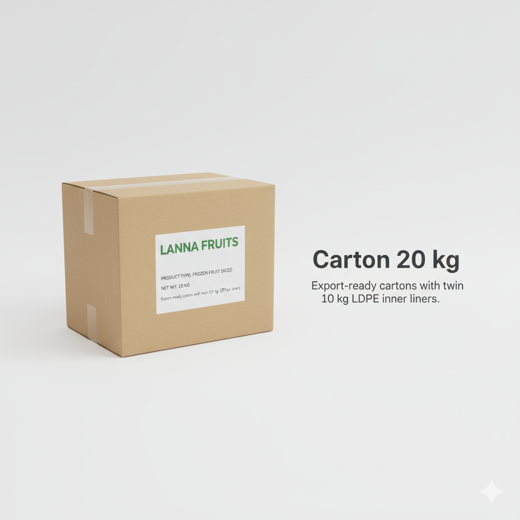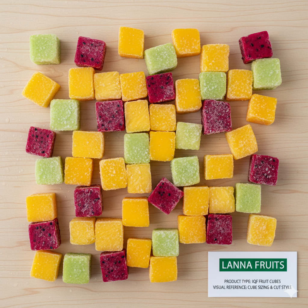 Individually Quick Frozen dices, off-cuts and cubes processed with fluidized-bed freezers to lock in colour and nutrition. Ideal for smoothie kits, toppings and rework minimization.